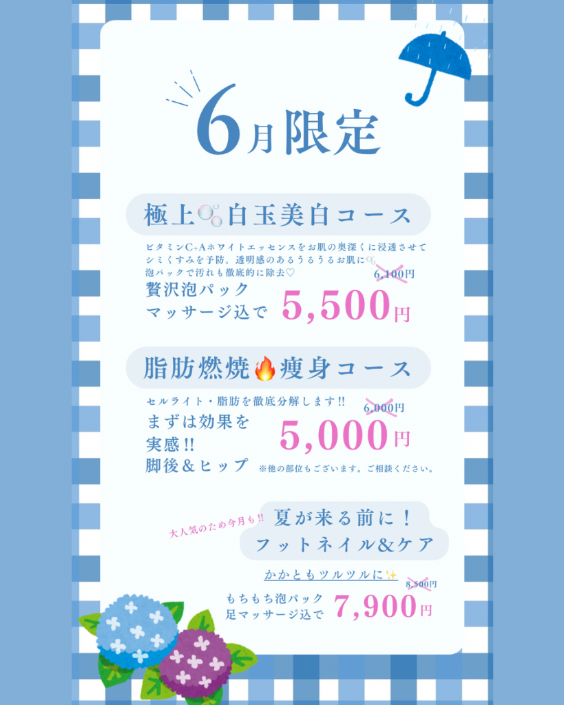 先月予約殺到した大人気のメニューです♡足にパック&マッサージでツルツルになっちゃいます☺️